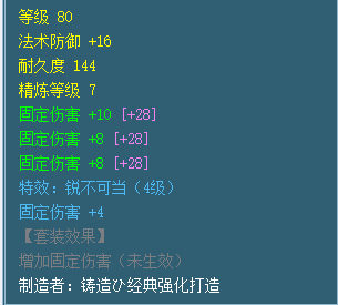 2.锐不可当:固定伤害+(特效等级*1),4个部位特效相同。套装效果:固定伤害+X!8级(12)、16级(24)、24级(36)、28级(42)、32级(48)