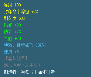 3. 健步如飞:速度+(特效等级*1),4个部位特效相同。套装效果:速度+X!8级(7)、16级(14)、24级(21)、28级(24)、32级(28)