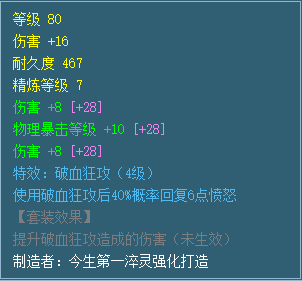 1.破血狂攻:(戒指、耳饰)使用破血狂攻后有(特效等级*10)%的概率回复6点愤怒。(佩饰、手镯):使用破血狂攻临时增加(特效等级*2)的伤害。套装效果:破血狂攻造成的伤害提升X%!8级(2%)、16级(4%)、24级(6%)、28级(7%)、32级(8%)