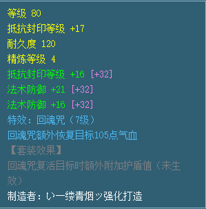 2.回魂咒:(戒指、耳饰)使用回魂咒后有(特效等级*10)%的概率回复6点愤怒。(佩饰、手镯):回魂咒额外恢复目标(特效等级*15)的气血。套装效果:回魂咒复活目标时额外附加X点护盾值!8级(375)、16级(750)、24级(1125)、28级(1313)、32级(1500)