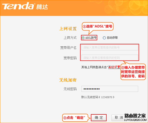 ADSL拔号:在设置页面中选择“ADSL拨号”, 在“宽带用户名”、“宽带密码”中输入宽带运营商(例如:电信、联通等)提供的宽带用户名和密码 ,点击“确定”即可。