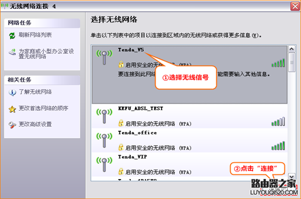 l 点击桌面右下角的无线网络连接图标 ,在打开的信号列表中选择路由器的无线信号后点击连接按钮。
