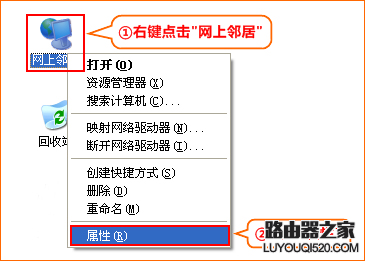 1.右键点击桌面上的“网上邻居”,选择“属性”:
