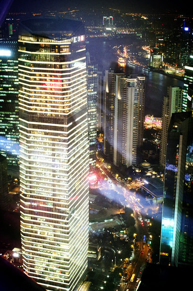 下了渡轮还要步行接近半个小时,感觉在上海生活的人真的要很能走啊,随随便便就是半个小时的路程,检票进入东方明珠后,还要排队乘坐电梯到达第二个球体,看着应该是五一十一用过的盘旋排队护栏,就能想象人多的时候有多可怕,等了大概20分钟吧,终于到我们了,上去的时候已经是夜晚了,一下就被这上海的黄浦江美景震撼了,曾经去过香港的维多利亚湾的我,也觉得这里更美。