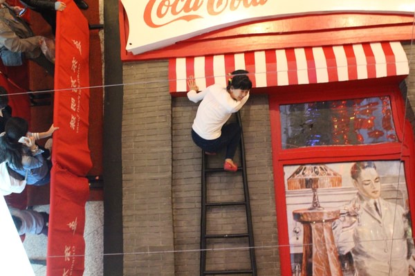 实在太冷了,没有心情赏景了,直接坐观光梯到0米大厅,这个是好玩的镜子照相,利用反光把人照出蜘蛛侠的感角,要排队的,一组六个人,2分钟时间,不收费。