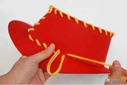 将不织布裁成长条梯形,作为帽身。将帽身对折,用锁边(从上往下)的方法进行缝制。
