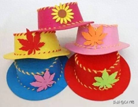 粘贴上一个漂亮的小枫叶做装饰,一顶漂亮的DIY手工礼帽就做好了