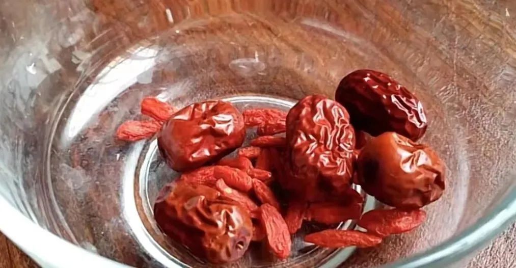 矿泉水炖出来的汤更加的清甜。盖上盖子,大火烧开,再来准备一小把枸杞,几颗红枣,加入一点淀粉给它抓一下,这样可以