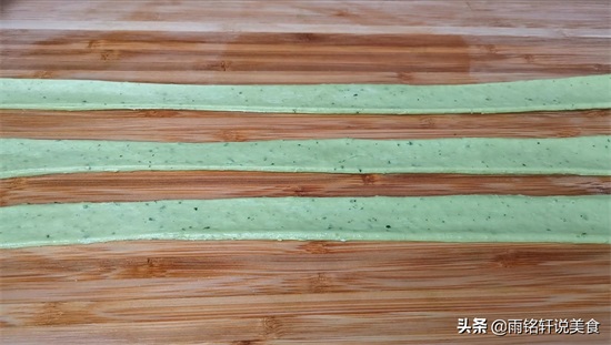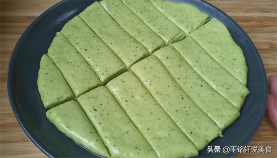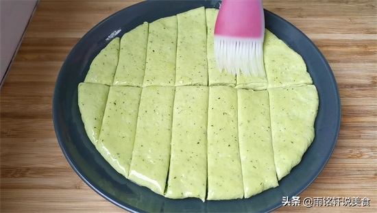 第六步:然后用刀把它切成条,再从中间切一刀;准备一个盘子,盘子里刷上食用油,把切好的面饼放入盘子里,面饼上再刷上一层食用油锁住它的水分,盖上保鲜膜醒发一个小时。