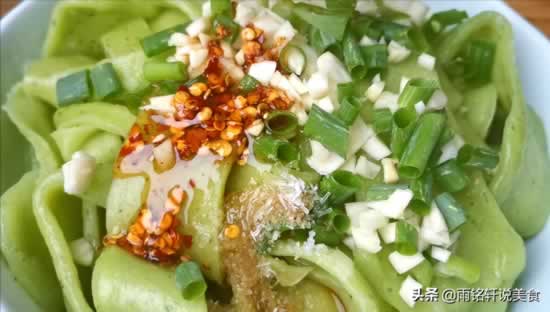 第十二步:把宽面条煮熟即可捞起沥干水放碗里,放入切好的蒜末、葱花,调入半小勺盐、鸡精,生抽、陈醋、辣椒油、香油各一汤勺,再倒入适量的热油,然后用筷子搅拌均匀即可享受美食了。