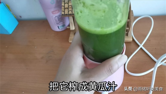 第二步:往榨汁机里倒入适量的清水,把它打成细腻的黄瓜汁。