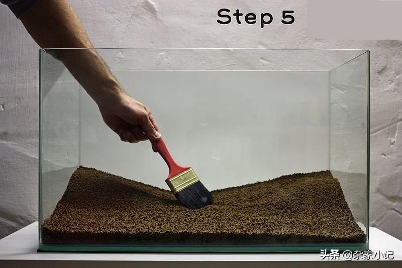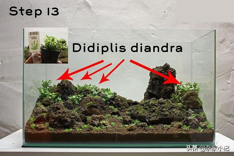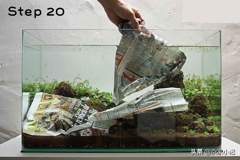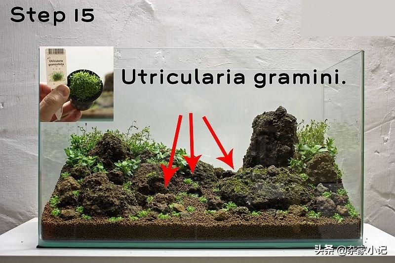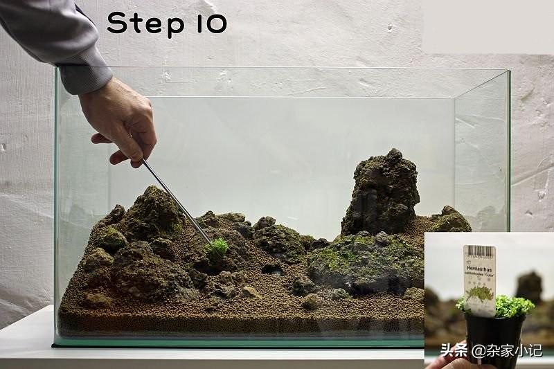 接下来的工作就是种植水草,可以看到,布置时是不加水的,这样更容易种植水草,可以避免水体浑浊,使用细摄子种植小片的水草,这样更容易一些.