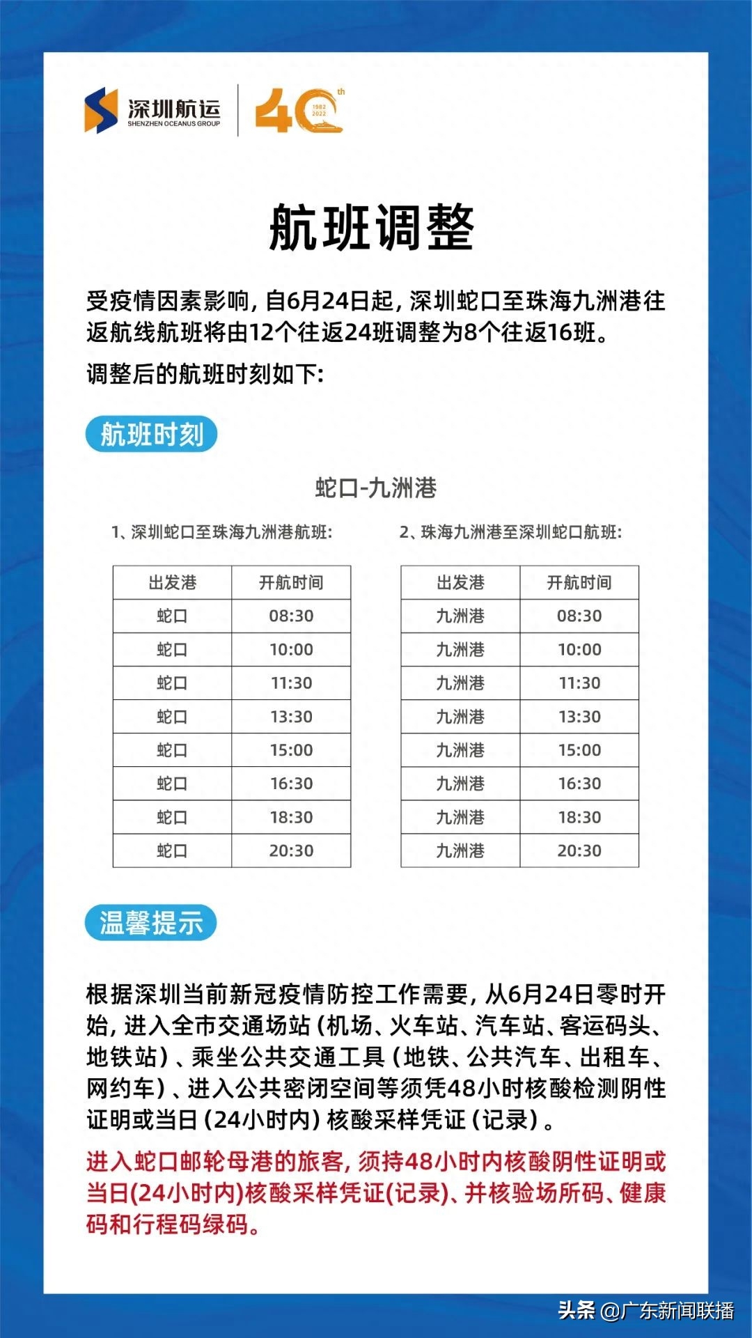受疫情因素影响,自6月24日起,深圳蛇口至珠海九洲港往返航线航班将由12个往返24班调整为8个往返16班。