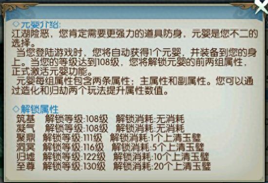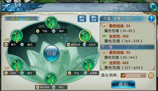 通俗的来说就是通过等级+道具的激活你的元婴个数,共有六个元婴,每个元婴有主副两个属性,其中主属性固定,副属性可以洗(也就是所谓的归劫,不过是随机属性的归劫)。