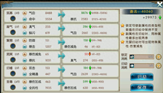例如上图的一次洗炼,道法提升了29973,因为洗炼除了一个爆伤和一个爆减的副属性,这两个属性怎么能不要呢?果断点击保存!