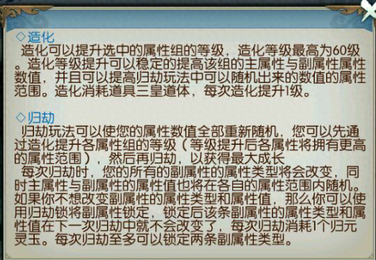简单的解释一下,造化就是提升主副属性,归劫就是转化副属性!