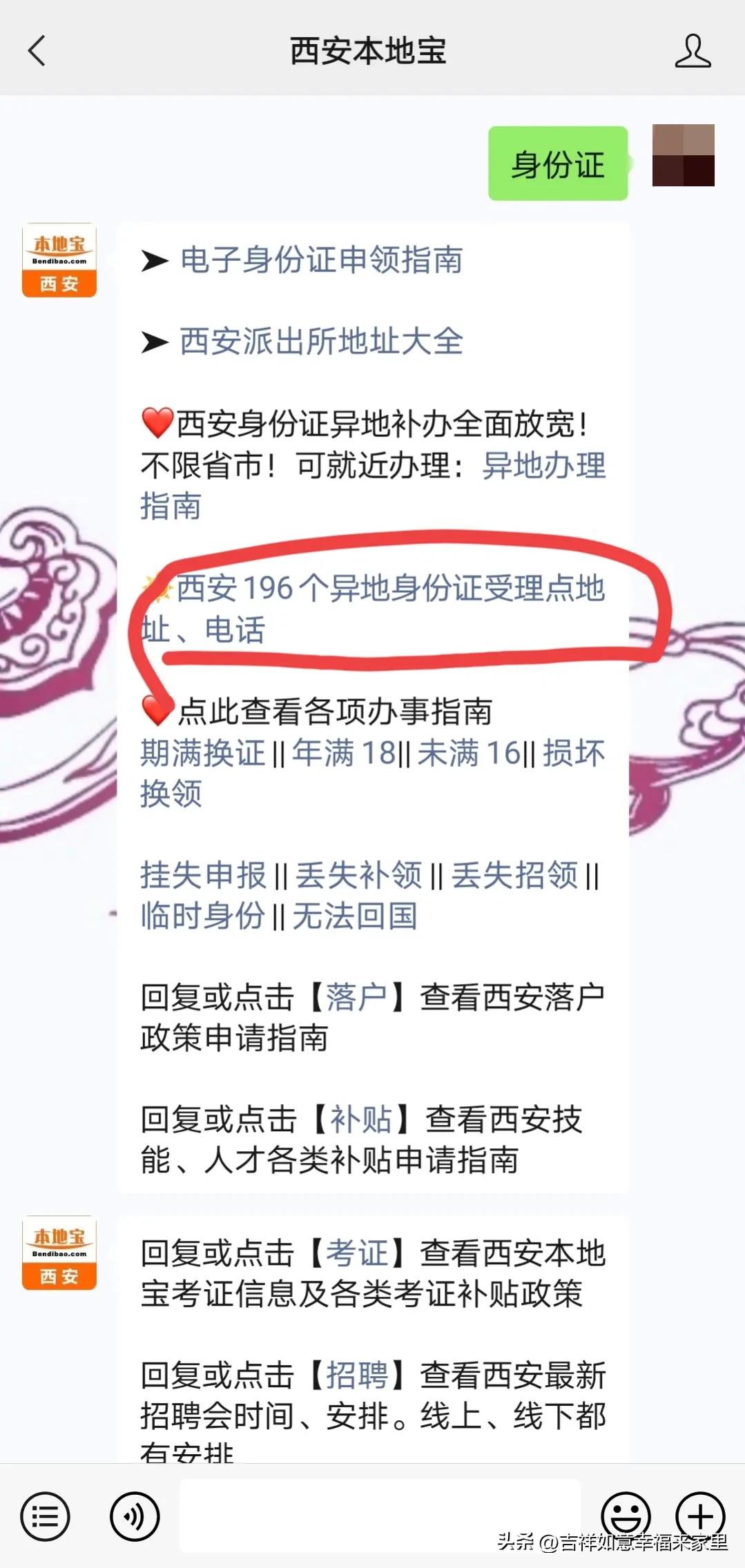 然后在小程序关注当地本地宝(以西安为例,西安本地宝),在本地宝对话框输入一下身份证,就会出现异地身份证办理的界面。