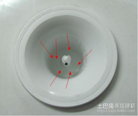 2、如下图所示的箭头部分的四周就是我们主要清洗的重点,我们把消毒液到在里面,注意不要太多,太多会有腐蚀作用,一般就用我们买的小瓶的矿泉水的瓶盖,装一瓶盖就可以,导入消毒液之后我们用杯子往里面倒一些干净的水,让水浸泡着中间那个塑料棒,大约浸泡五分钟,然后我们用牙刷把四周都刷一遍。