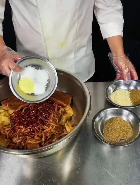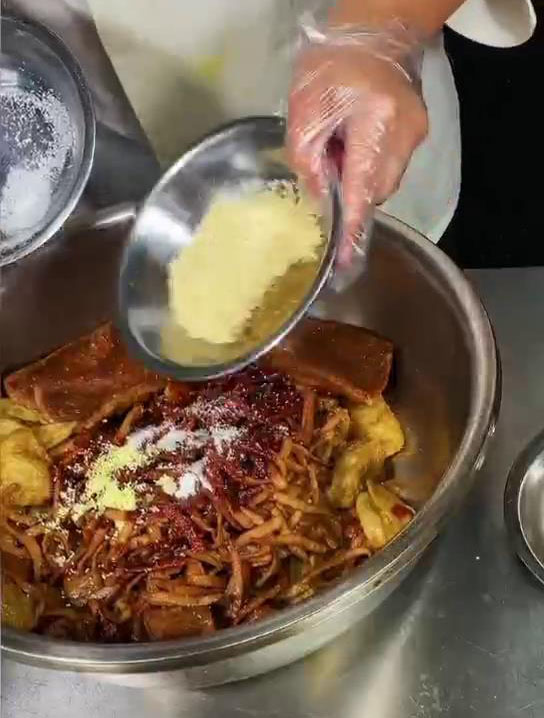 这个时候差不多食材已经泡好了,泡软就行,但是不要泡烂了,所以在泡制时,最好用凉水去泡,咱们将所有的原材料给他挑出之后,沥干水分,锅温控制在180度,放入油锅中炸制。炸至表皮微微的发黄,给他捞打出,以此类推,把所有的原材料,也是一样炸制表皮微微发黄,在炸制时油温呢不能太低,太低的话容易清油,油温保持在180度,炸好之后,放入咱们提前准备好的辣椒油,然后盐,味精,鸡精,白糖,花椒粉跟熟芝麻孜然粉稍微多一点,抓拌均匀就可以了。