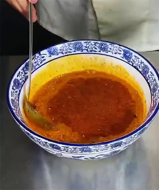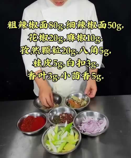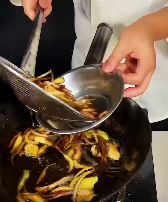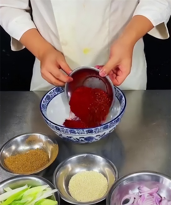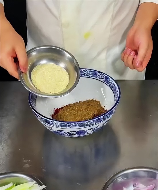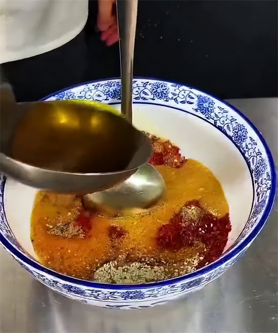接下来开始熬制料油,凉油放入洋葱以及葱姜,大火烧开,小火慢慢的给它炸制,榨干榨至微微发黄,把葱姜料葱打出油锅,再次把油温烧到180度,倒入提前准备好的辣椒面当中,最后加入少量的白酒,击出香味。