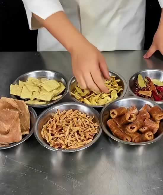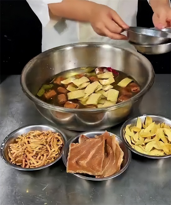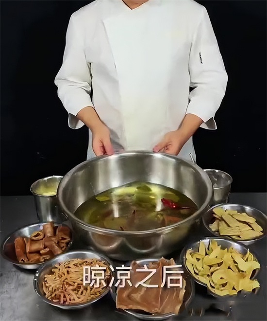 由于我们做素肉用的食材属于干制的,先准备一盆水,把材料全部放在水中泡发,在泡发的时候,准备一个香料水,首先准备的草果,桂皮,八角,香叶,花椒,干辣椒,用大火给他烧开,熬制20分钟,这个料水煮好之后,一定要给他晾凉,晾凉之后,咱们加入少许的盐,给他一个底味,然后再来点鸡精,把咱们所有的食材,倒到这个药水里面,开始浸泡。由于买回来的豆制品,属于含盐量比较高的,浸泡的这一步就不用放盐了,在浸泡的时候,一定要注意,要用凉水浸泡,浸泡最少4个小时.
