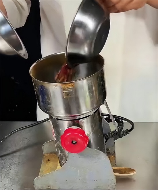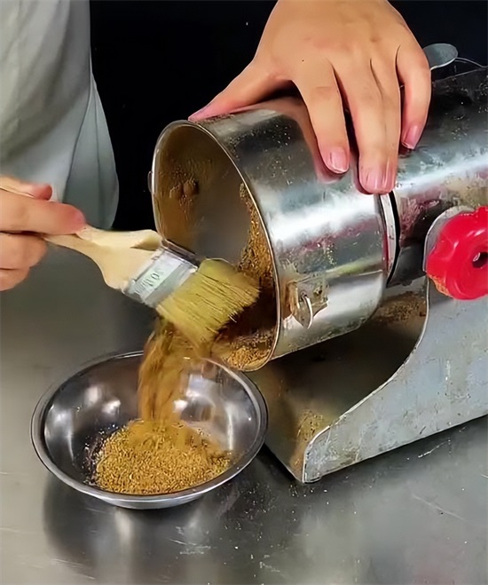 在浸泡的时候开始做手撕素肉核心的调料,辣椒油,辣椒油用到几种的香料,有花椒,麻椒,孜然颗粒,八角,桂皮,香叶,草果,白扣,将所有的香料,放入机器给他磨成细粉状,碗中放入辣椒面儿,粗细辣椒面,粗辣椒面的增香,细辣椒面增色,然后放入咱们刚才打好的料子料粉,白芝麻。