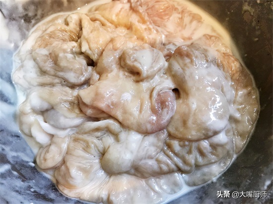 2、面粉、淀粉都有很好的吸附性,和粘液混合在一起,就变成了一坨一坨的,把脏东西都吸附下来了。再用清水把猪大肠冲洗2遍,表面的粘液就被洗掉了,变得非常清爽。