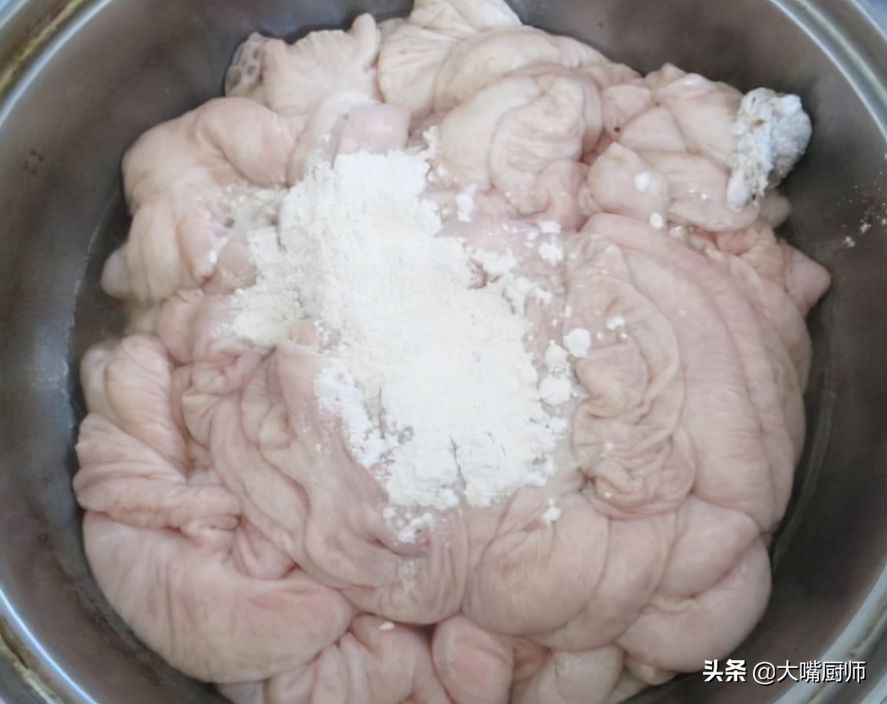 1、猪大肠的表面,有一层黏糊糊的透明粘液,用水根本冲不掉,直接放入盆中,加入一勺面粉、一勺淀粉,再倒入适量清水,用手抓洗,把面粉、淀粉抹在猪大肠表面。