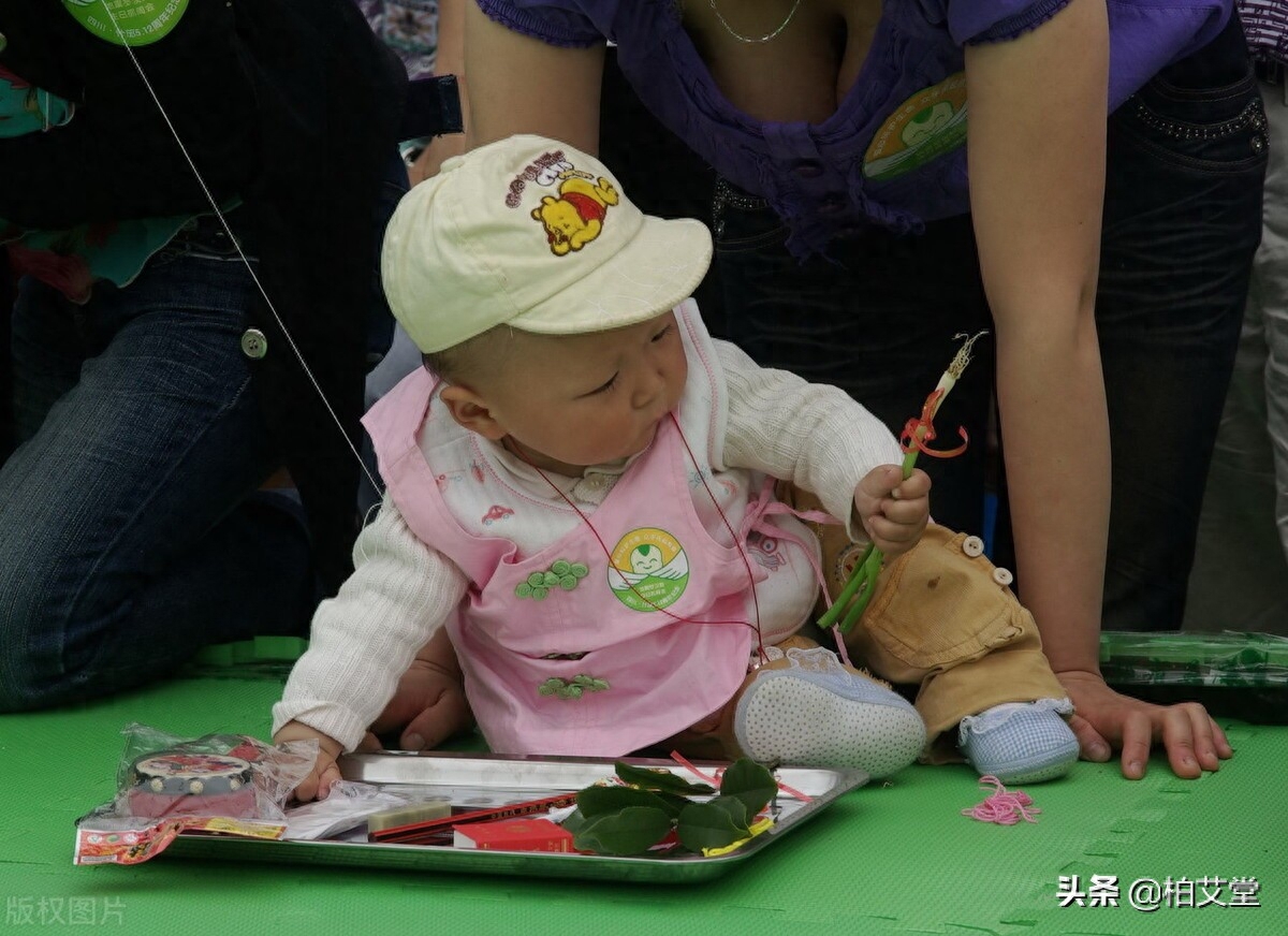 抓周呢,也就是在小孩子周岁生日的时候,家里准备各式各样的物品让孩子来抓,并用抓取的东西预测未来的习俗。