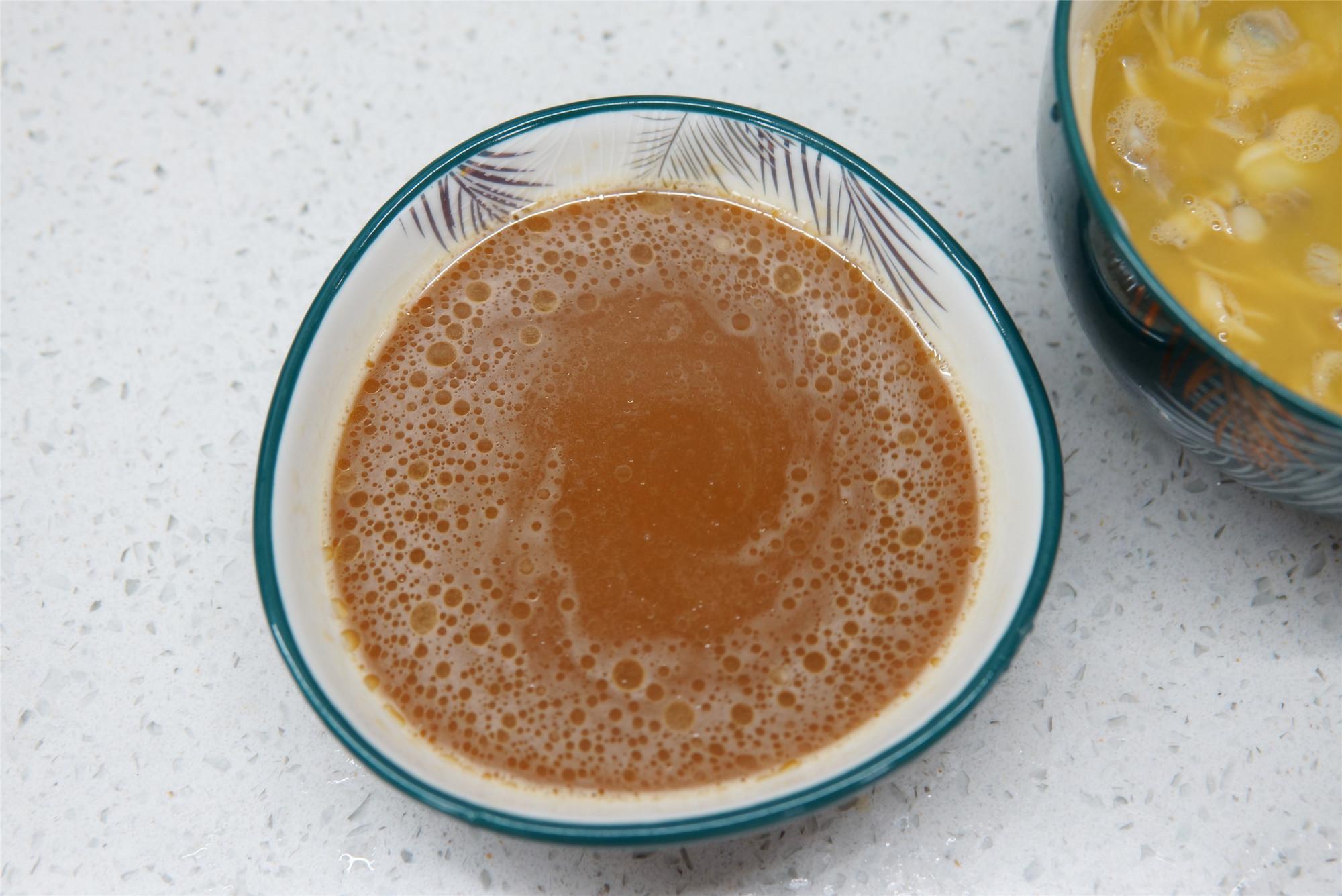 第五步:调制料汁,在碗中加入2勺生抽,1勺香醋,半勺香油,半勺白糖,1勺淀粉,2勺清水充分的搅拌均匀,调料汁是酸甜口味的,喜欢酸味重的可以再多加1到2勺香醋。