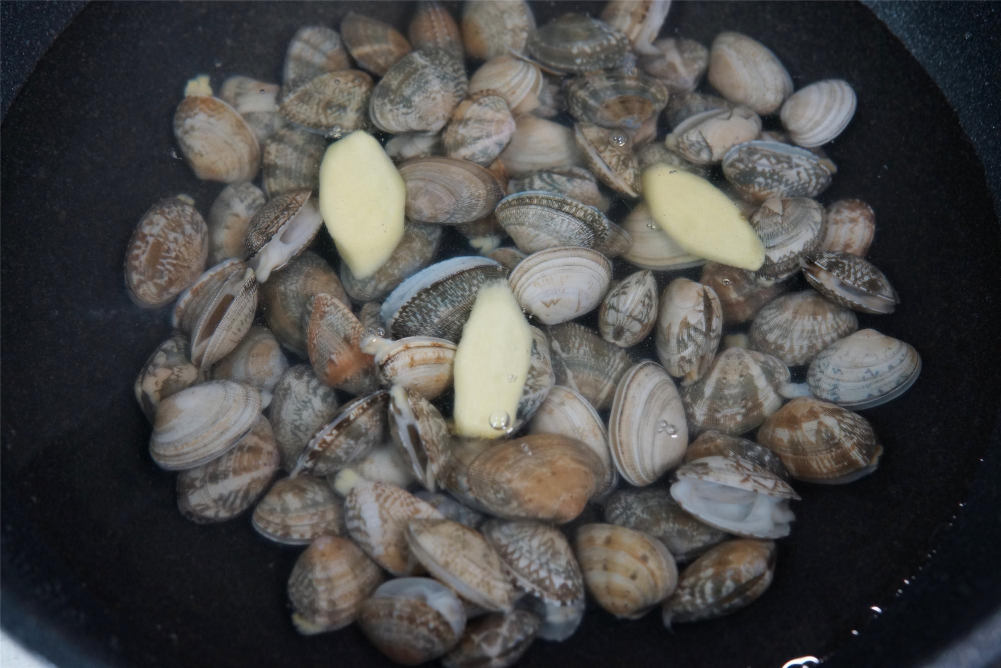 第三步:花甲焯水,锅中加入适量水,冷水锅倒入吐好沙的花甲,加入3片姜片,1勺料酒去腥,花甲煮至开口盛出晾凉后剥取花甲肉备用。(也可投至冷水中给花甲快速降温)
