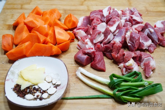 第一步:新鲜的好羊肉表面是干燥的,颜色淡红,带有一些筋膜,将羊肉切成大块备用;胡萝卜冲洗干净切滚刀块;3根小葱打结,姜片和5克花椒准备好,还要用到5克白芷,卖调味料的地方一般都有。