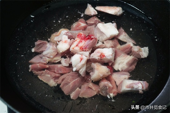 第二步:铁锅中放大量的清水,一斤羊肉大约要放4斤左右的水,冷水将羊肉下锅,在加热的过程中,可以缓慢的将羊肉中的血水逼出,减少羊膻味。
