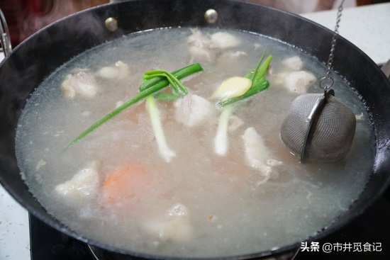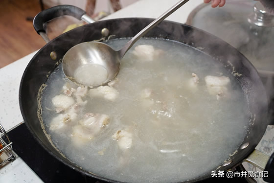 第三步:大火将锅中水烧开,用勺子撇去锅中的浮沫,这些都是血沫,撇干净汤会更鲜。