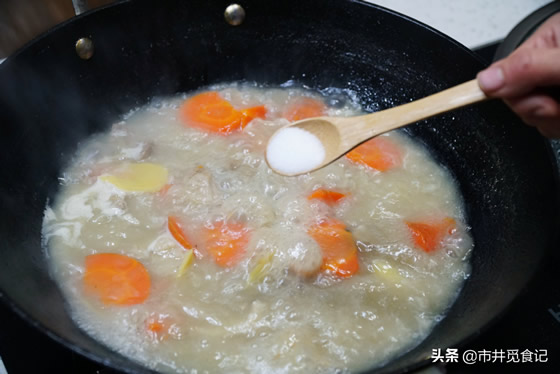 第六步:锅中的羊肉汤汁收到一半的时候,锅中的羊肉就基本炖好了,加入适量的盐,煮上1分钟化开,这锅香味扑鼻,羊肉鲜嫩,羊肉汤鲜甜味美的胡萝卜炖羊肉就做好了。
