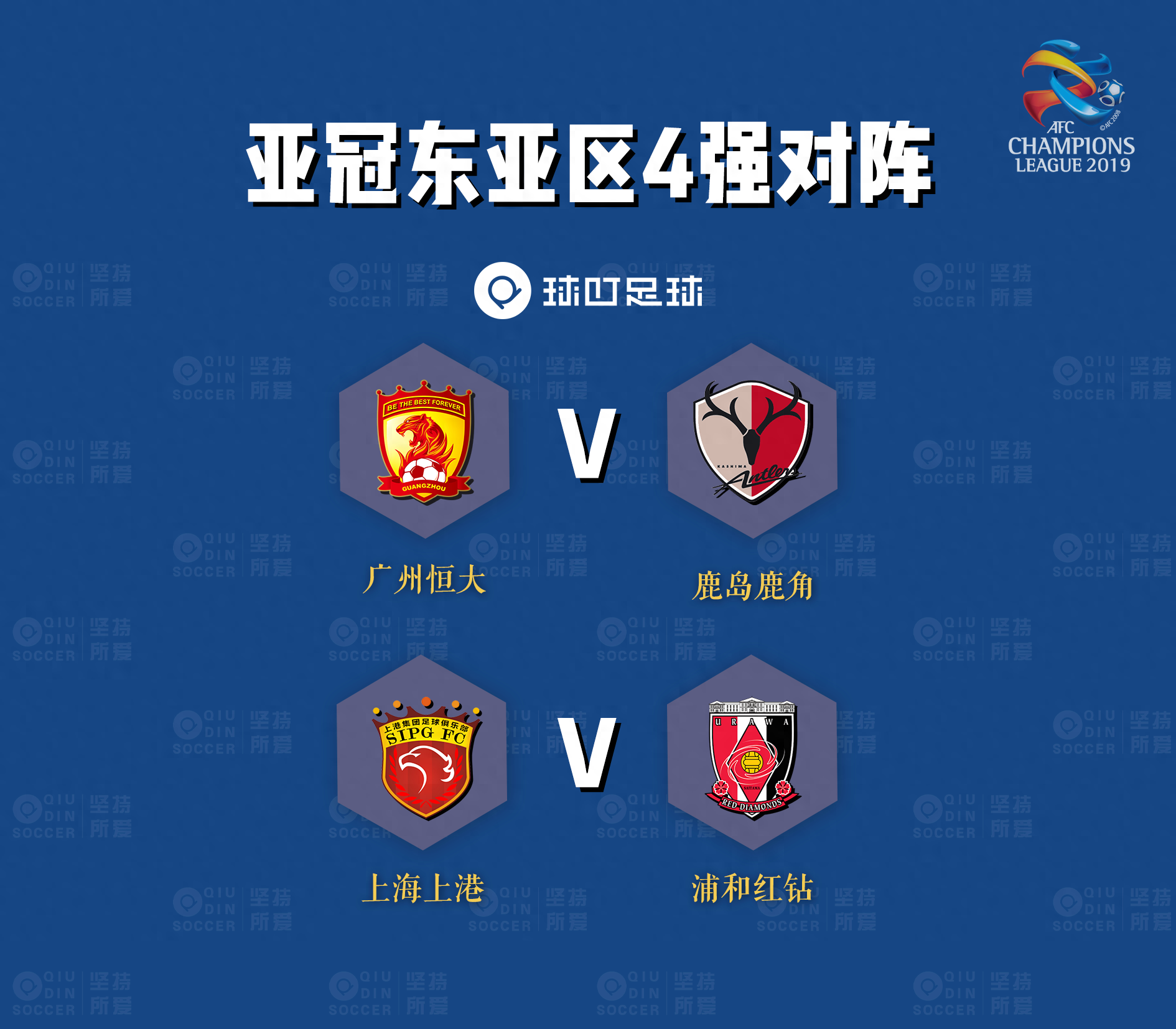 由于卡塔尔在今年夏天受邀参加在巴西举行的美洲杯,亚冠西亚区的1/8决赛延期至本月进行,而东亚区的1/8决赛早已在6月底结束,最终来自中国的广州恒大和上海上港以及来自日本的鹿岛鹿角和浦和红钻分别淘汰各自对手晋级八强。且1/4决赛对阵也已确定,广州恒大和上海上港将分别对阵鹿岛鹿角和浦和红钻。