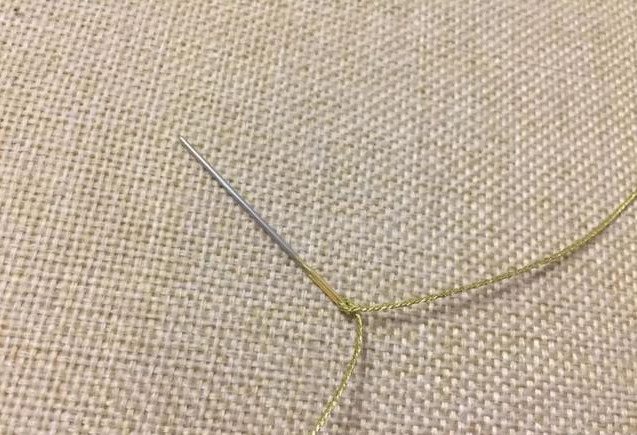 第十三步,准备一根1.5米的金股线,穿进针眼一小段。