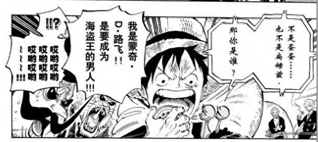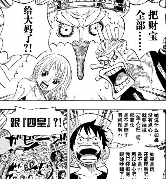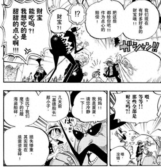 大妈想要鱼人岛供应甜点,路飞却说被自己吃掉了。从而保护了鱼人岛。