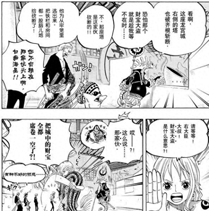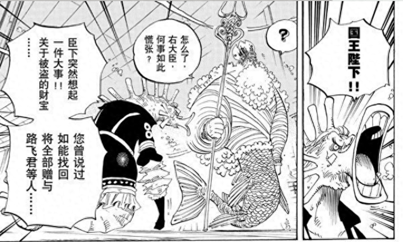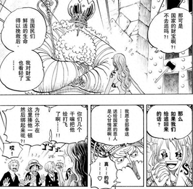 在回来交代事情的时候,娜美和国王大臣同框,而其他人全部是吃惊的表情,除了罗宾。