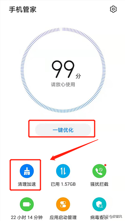 打开手机管家APP,在APP里最直观可以看到一个打分,打分越高表示手机越流畅。本人手机99分,属于比较流畅。如果不流畅,可以点击“一键优化”功能,系统自动帮你优化。但是这个优化无法删除垃圾文件。