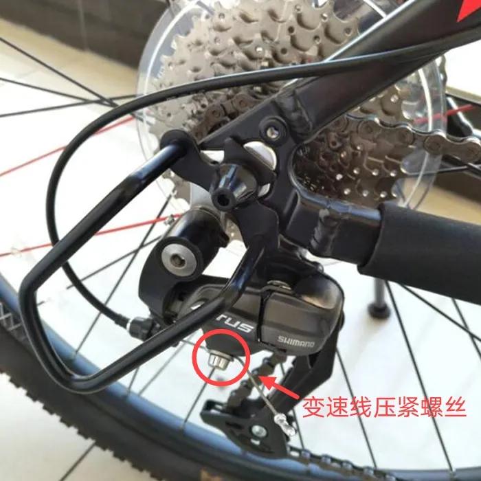 如果上面几种情况通过拧松或拧紧变速线松紧微调无法完成操作,就需要使用工具直接拧开变速线压紧螺丝拉紧或者放松之后适当微调了,变速线松紧微调旋钮拧到适当位置,不可过松或过紧,以备日后微调有足够空间。
