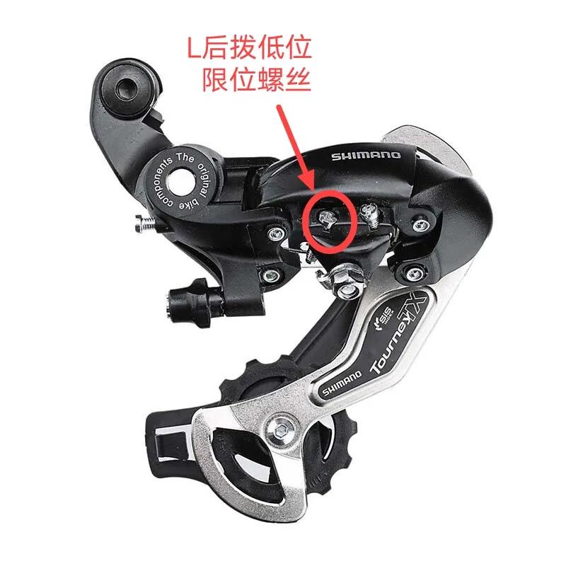 还有一种情况也是比较常见的,就是我们在骑山地车变速使用到最大飞或者最小飞的情况下,会出现掉链子现象,有时候在操作变速器往最大飞轮齿片调整时链条会跨过最大飞齿片掉到辐条一侧,这就说明我们的后拨低位限位螺丝需要顺时针拧紧一些,只要拧到可以顺畅变到最大飞而不掉链子即可。如下图所示螺丝,螺丝旁边标注有英文字母L,当然我这个后拨是比较低端的,限位螺丝就跟我们正面相对比较容易分辨,有些稍高级别的后拨限位螺丝是在自行车尾部向后方向,大家有不同情况能找到就行。