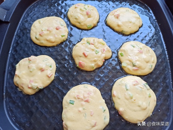 9、电饼铛提前预热,刷上一层油,把面糊挤入锅中,个头按照喜好来,不用着急翻动,先等它定型。