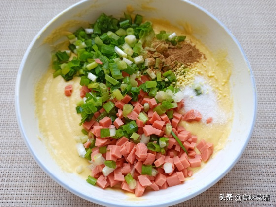 7、切一些火腿丁、葱花放入面糊中,再根据个人口味,加食盐、鸡精、十三香,充分的搅拌均匀。