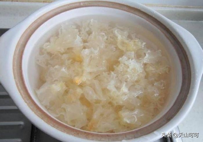 可可提示:千万不要用开水泡发银耳,这样银耳不但营养流失,而且泡发量也不好,质量就更差了。