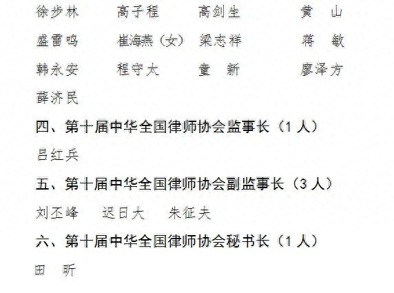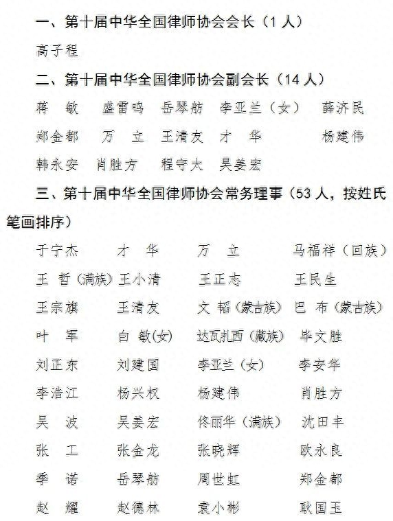 第十届中华全国律师协会会长、副会长、常务理事监事长、副监事长、秘书长名单