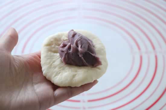 5、取第一个醒发好的面团,用擀面杖轻轻擀成中间稍厚边缘稍薄的饼皮,准备提前做好的馅料,我这个是芋泥馅料,也可以换成其他的馅料,比如豆沙馅料,包入适量的芋泥馅料;