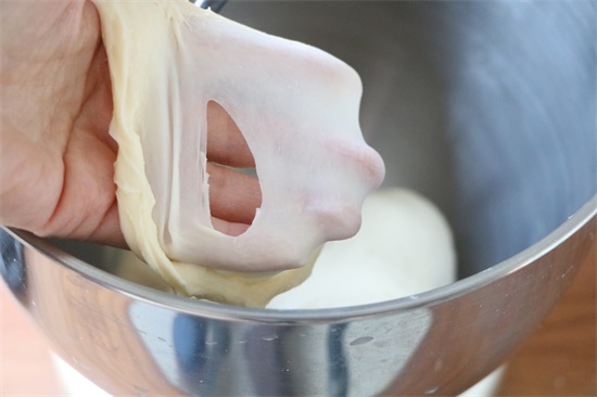 2、然后先开低速揉面,看不见干粉再转到高速,揉至光滑的程度,停下机器检查面团,能拉出有韧性的厚膜就可以,再加入提前软化的黄油、盐,先低速再转高速揉至面团完全把黄油吸收了,面团变得光滑,停下来再检查面团,能拉出薄而不易破的膜就可以;