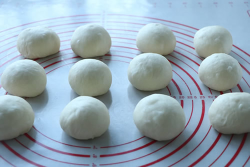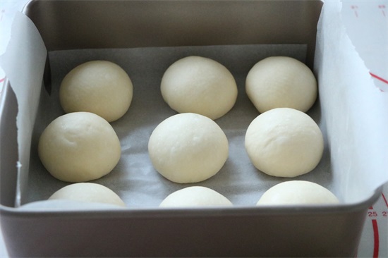 4、把面团倒在面板上面进行分割,分成均匀的9等份或是12等份,再把每个面团滚圆,密封醒发20分钟左右;