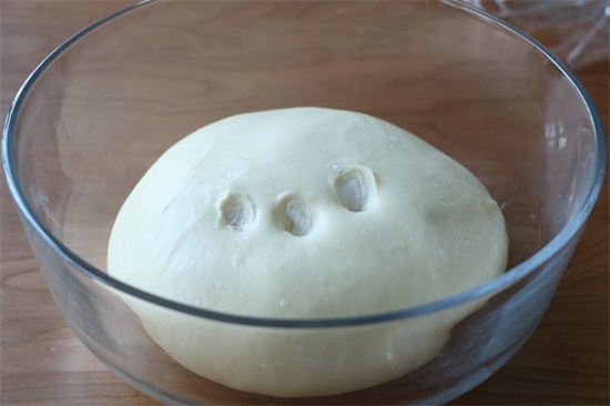 3、把揉好的面团折叠出一个光面来,放在盆中进行一次醒发,温度不要超过25度,湿度保持在75%左右。大约醒发45分钟左右,手指沾面粉按压面团,按下的面团有缓慢回弹就可以;